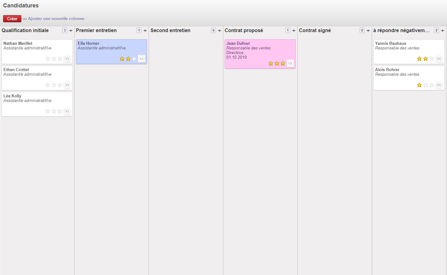 Les différentes étapes d’embauche sont entièrement personnalisables et grâce à la vue Kanban, vous profitez d’une vue organisée sur l’ensemble de votre processus d’embauche. Les candidatures reçues se placent automatiquement sous la première colonne nommée (par exemple) « réception candidatures ». Vous déterminez vous-mêmes les étapes qui doivent suivre, selon le nombre d’entretiens téléphoniques ou physiques, la proposition de contrat, les réponses négatives à faire parvenir ou autres étapes-clé de votre procédure d’engagement.